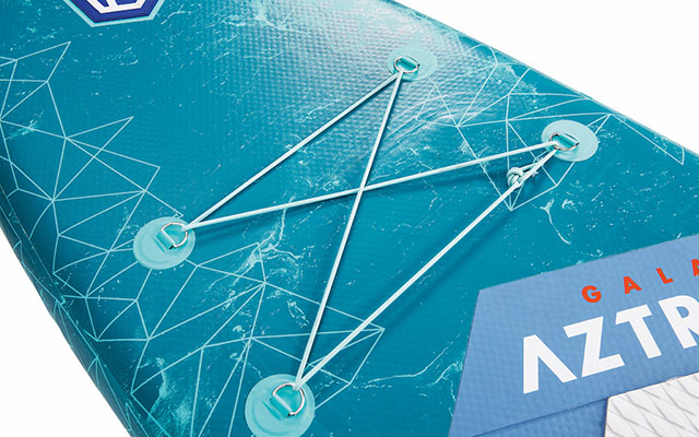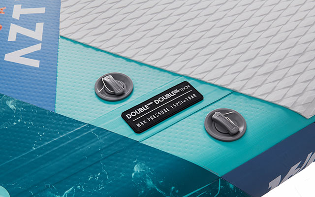De Aztron-constructie met dubbele kamer geeft de vaarder het gevoel dat hij op een stevig bord peddelt. Bij Aztron wordt de dubbele kamer technologie toegepast op alle opblaasbare boards.