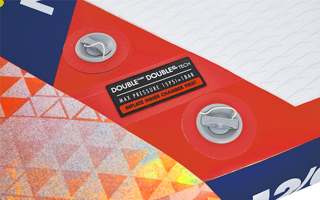 De Aztron-constructie met dubbele kamer geeft de vaarder het gevoel dat hij op een stevig bord peddelt. Bij Aztron wordt de dubbele kamer technologie toegepast op alle opblaasbare boards.