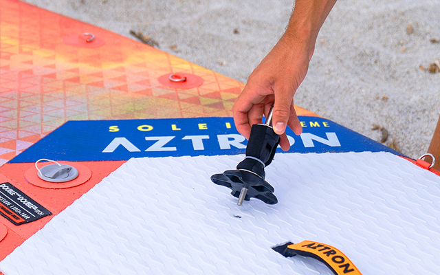 Het opblaasbare SUP-board Aztron Soleil Xtreme 12'0" is uitgerust met een standaard mastvoetinzetstuk waarin een traditionele mastvoet kan worden bevestigd voor windsurfen.