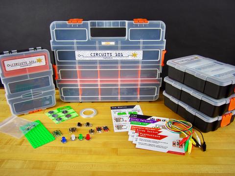 Circuits 101 Sets wordt geleverd met 4 stuks studentenboxen gevuld met elektronica-onderdelen en -benodigdheden. Docenten kunnen gemakkelijk de dozen uitdelen en ons gratis curriculum en onze middelen gebruiken om snel en eenvoudig lessen uit te voeren. Elke set wordt geleverd met een Teacher Box met een volledige set van leveringen, evenals extra batterijen, tape en informatiekaarten. Elke studentenbox is een complete set van leveringen bestemd voor een groep studenten. (We raden groepen van niet meer dan drie studenten aan.)