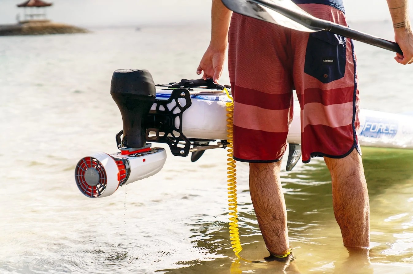 De Bestway Kahawai SUP inclusief de gemoriseerde KIT wordt met zijn montagebeugel aan de achterkant van de SUP bevestigd, zonder het ontwerp en de ergonomie te veranderen.