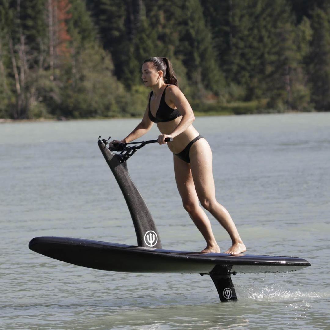 eFoil, waterscooter of elektrische jetski? Misschien een beetje van alles. U kunt met de Hydroflyer over het wateroppervlak rijden zonder op te stijgen. In dit geval zou de rijervaring te vergelijken zijn met die van een elektrische jetski (stander) of misschien wel een scooter of elektrische scooter op het water. Rijden op de oppervlakte - inclusief lanceren - is erg gemakkelijk omdat het stuur je stabiliteit geeft. In 2023 zou er een vinoptie moeten zijn voor de Hydroflyer : een korte vin met een motor die het board niet laat opstijgen.
