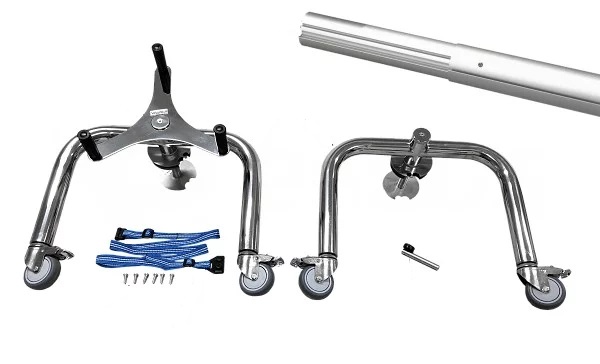 Dit rolgordijn is verrijdbaar 4WD — aan beide zijden U-vormige steunen op wielen. De telescopische stang is in lengte verstelbaar, geschikt voor elk zwembad met een breedte van 5,4 tot 7,1 meter. Het stuurwiel kan aan elke kant van de jaloezie worden geïnstalleerd.