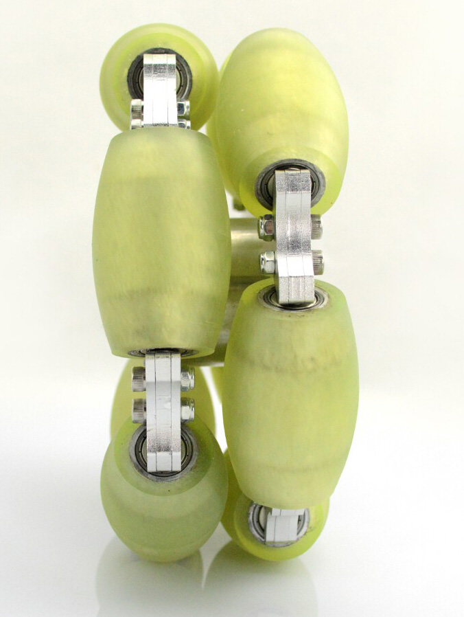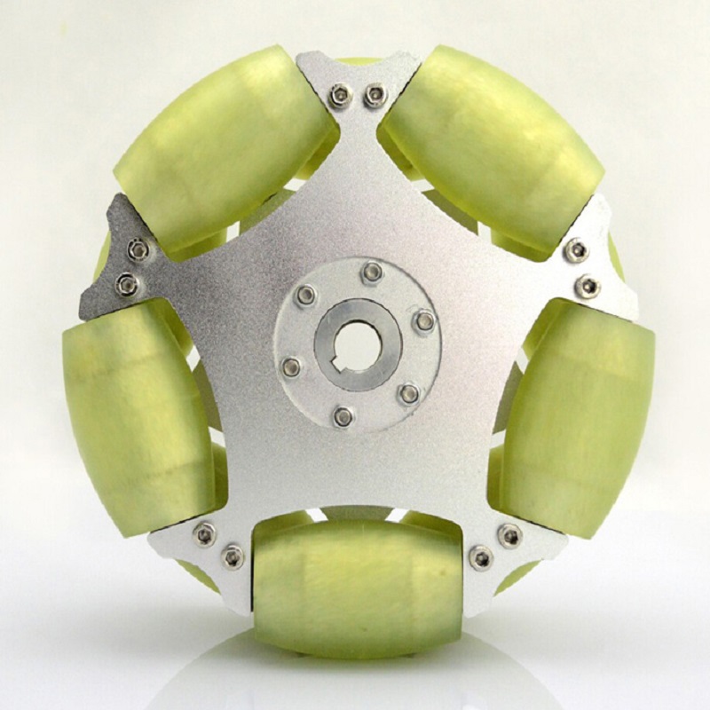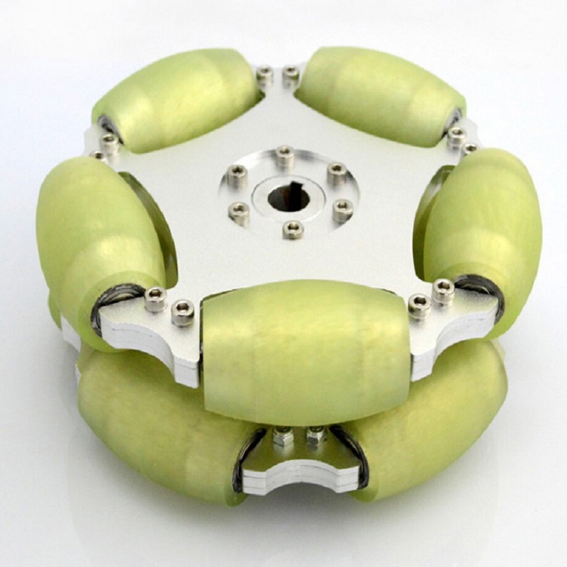 The (8 inch)203mm omnidirectional wheel,provides a maximum load capacity of 80kg. Two rolling bearings are embedded in each driven small wheel, which is composed of a polyurethane wheel and an aluminum wheel.