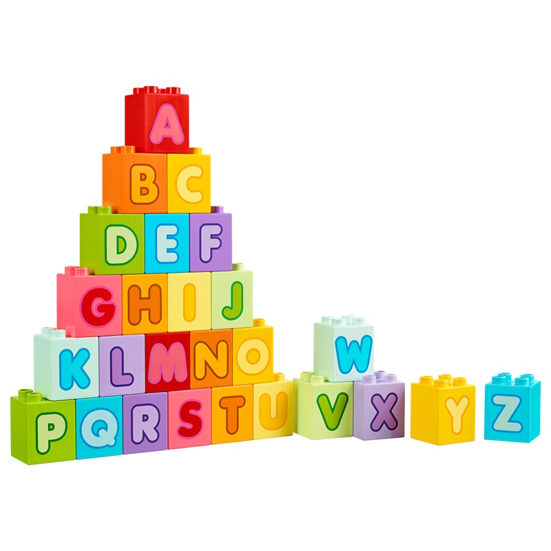 Werk aan schrijf- en leesvaardigheid door alfabetspel met een kleurrijke set LEGO® DUPLO stenen met letters.