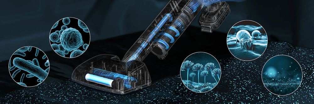 Het stofzuigt gewoon vuil van de vloeren en verwijdert allergenen, bacteriën, virussen en mijten met behulp van een UV + desinfecterende lamp van matrassen. Raycop OMNI AIR 2-in-1 voor uitgebreide schoonmaak van vloer tot bed.