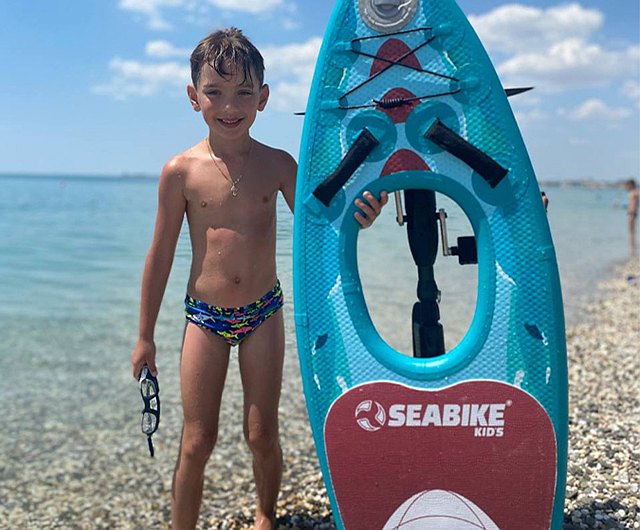De fiets is voorzien van een mechanische aandrijving, dus hij hoeft niet te worden opgeladen - hij is altijd klaar voor gebruik. Normaal gesproken duurt het niet lang voordat een kind het zwemmen beu is, met of zonder vinnen. Met de SEABIKE hoeven ze echter alleen maar te trappen en moeiteloos door zoet of zout water te bewegen zonder hun handen te gebruiken.