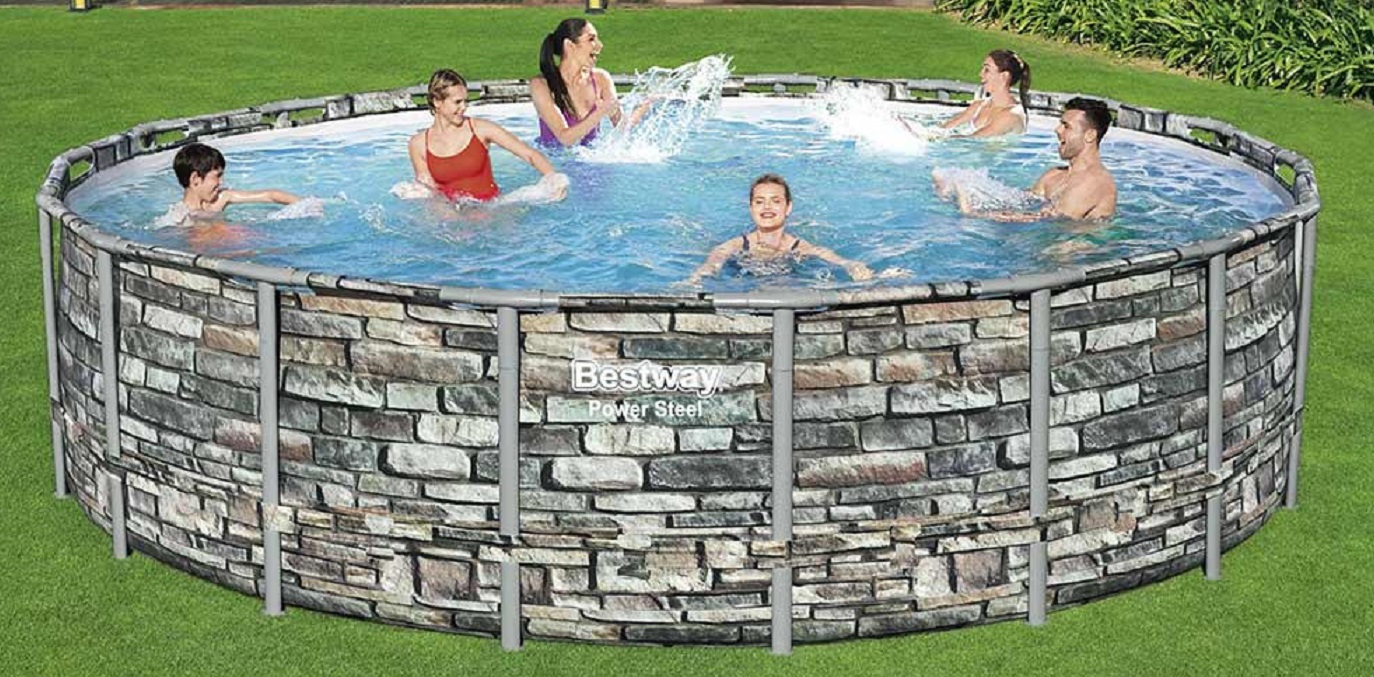 Bestway presenteert exclusief het Swing Elite Frame Stone design zwembad voorzien met een diameter van 488 cm en een diepte van 122 cm. Dit buisvormige zwembad heeft een innovatief imitatie-stone ontwerp dat zich opvallend onderscheidt van de traditionele PVC-baden in de kleur blauw.