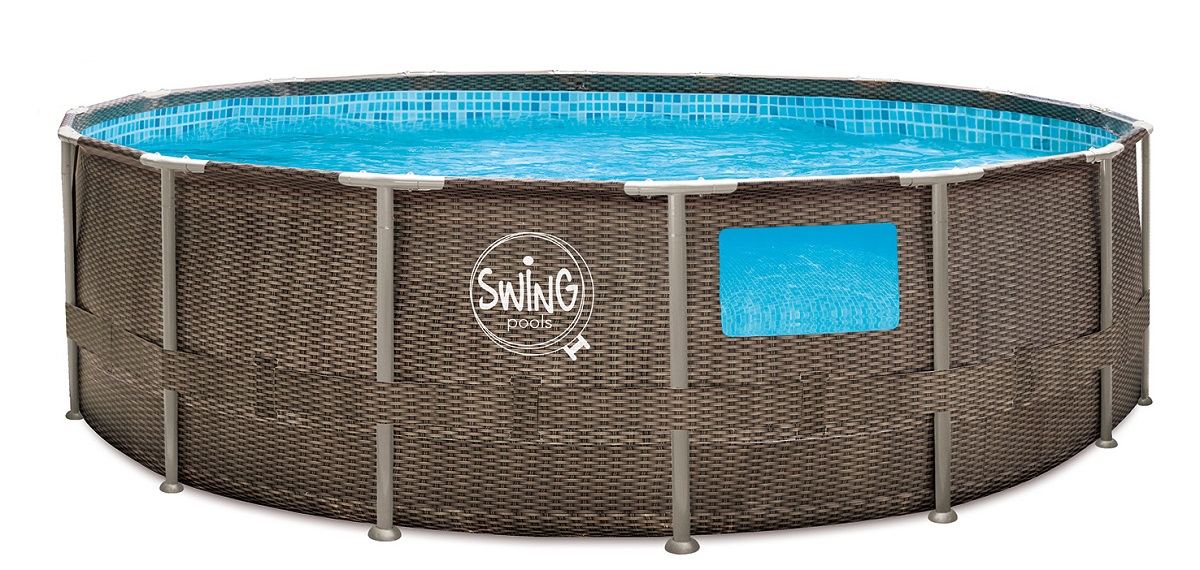 Bestway presenteert exclusief het Swing Elite-model voorzien van een venster met een diameter van 457 cm en een diepte van 122 cm. Dit buisvormige zwembad heeft een innovatief imitatie-rieten Wicker ontwerp dat zich opvallend onderscheidt van de traditionele PVC-baden in de kleur blauw.
